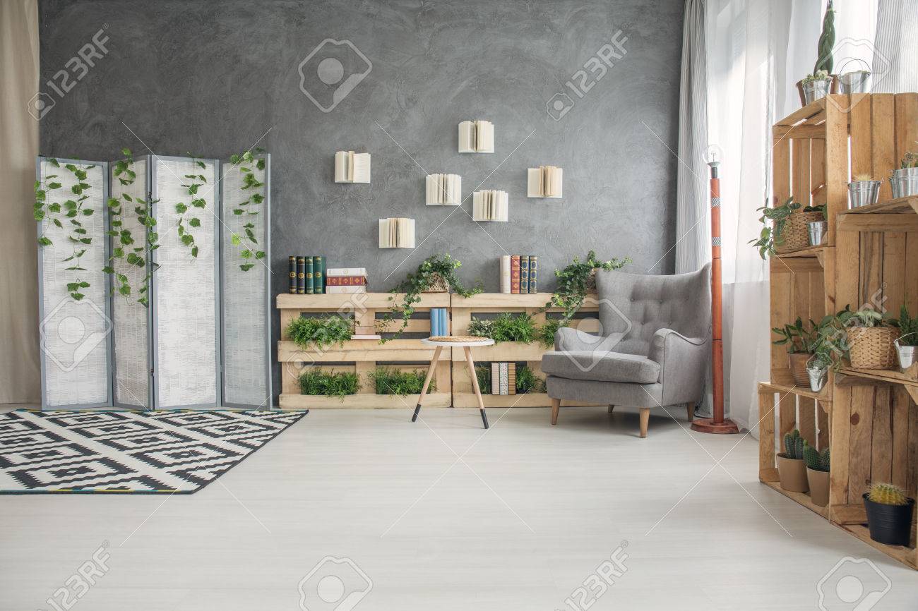 Elegante Sala De Estar Contemporanea Elegante Con Estantes De Paleta De Madera Diy Creativo Fotos Retratos Imagenes Y Fotografia De Archivo Libres De Derecho Image 81873780